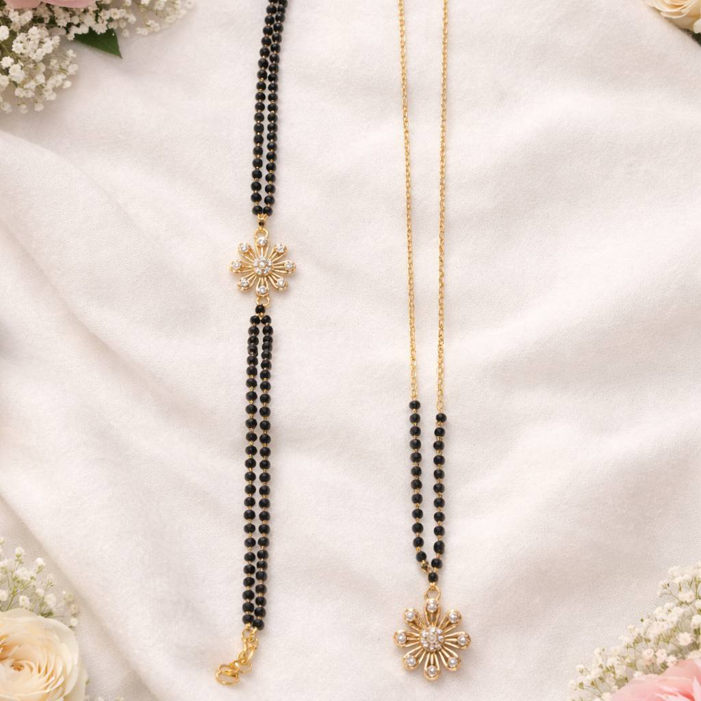 The mangalsutra features fine black beads that symbolize tradition and commitment. In addition, the floral pendant with sparkling crystal stones adds a soft and elegant shine. The matching bracelet complements the design perfectly, creating a coordinated and graceful look. Furthermore, both pieces are lightweight, making them suitable for all-day wear.