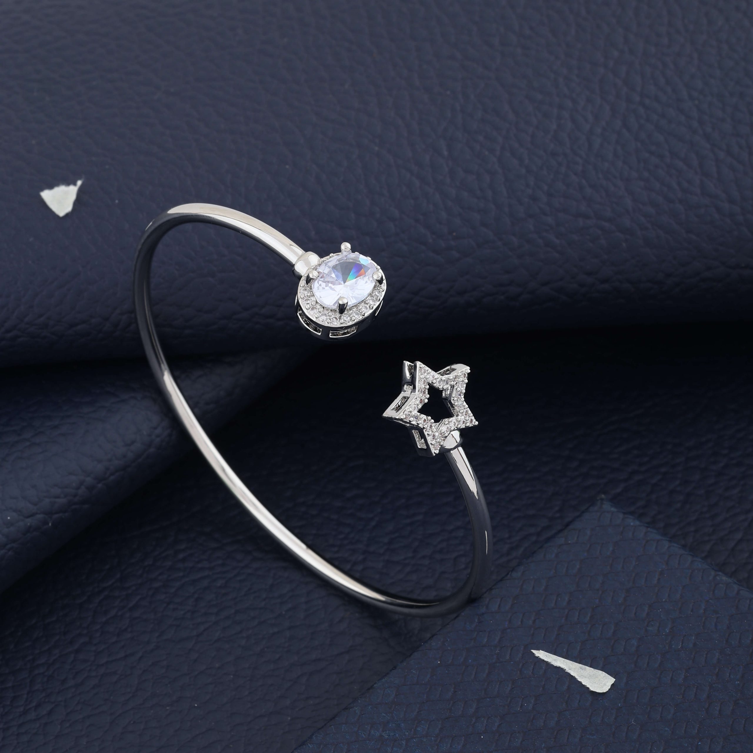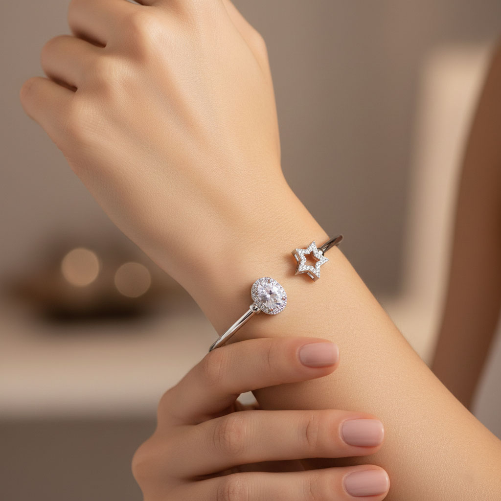 Elegant open-cuff kada crafted in a high-polish silver finish, designed with a unique dual-end concept. One end features a sparkling oval-cut crystal surrounded by a pavé diamond halo, while the other end showcases a delicate pavé-set star motif. The sleek open design ensures a comfortable fit and effortless wear, making it perfect for both everyday elegance and special occasions.